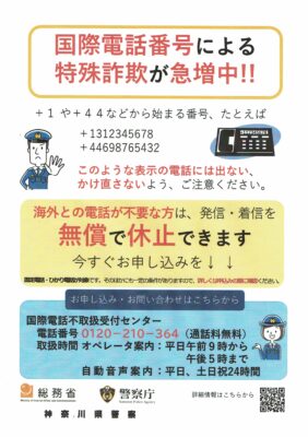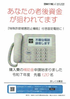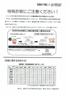 昨年度に続き「特殊詐欺被害防止電話機」等購入費補助制度が開始されました。購入を希望される方は鎌倉市役所(23-3000)地域のつながり課安心安全担当(内線2954)まで問い合わせてください。今年は自治会からの申し込みではなく個別の申請になります。先着順ですのでご注意願います。