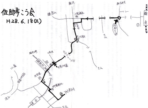 7月16日(土)、梅雨の晴れ間に恵まれた日ですが、前日の大雨で本日のコースを変えざるを得ません。予定では、八雲神社を経て梶原口から舗装された急坂を上り、途中から笹に覆われた坂を更に登り殿入の稜線沿いに野村総研跡地に行く予定でしたが、前日の雨しずくやぬかるみを避け、コースを次のように変更しました。佐助の紅茶専門店さんの店先にきれいな蓮の花が咲いており、八幡宮の源平池がきれいだろうと、蓮見のウオーキングにコースを決めました。紫外線予防と水分補給に気を付けながら佐助一丁目交差点をスタートしたのは、少し少なめの8名。