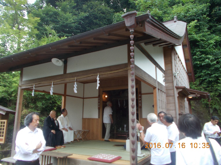 横須賀線の踏切を渡りしばらく進むと、普段は鉄の扉が閉じられている「第六天」への扉が開いており、例祭を行っている模様。聞くと、元旦と7月の例祭の年二日しか扉が開かれない貴重な日にぶつかったわけです。係りの方がもう間もなく祭礼が始まりますので、階段をお上がりくださいとの声に甘えて、苔むす鎌倉石の階段を上ると、社殿があり、神主さんとお坊さんが例祭の準備をされていました。(神仏習合)