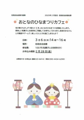 3月6日(木)14時から16時、佐助自治会館にておとなのひなまつりカフェをオープンします。参加費100円で、和菓子とお抹茶付きです。参加希望の方は、 2月28日(金)までにチラシの連絡先にご連絡ください。