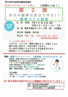 昨年開催した健康づくり教室を今年も開催します。開催日は10月3日(金)で、希望される方は地区の民生委員迄申し込んでください。締め切りは9月24日(水)です。