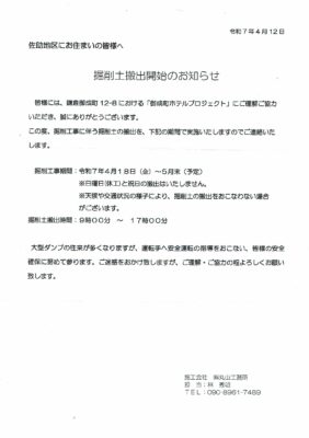 鎌倉駅西口の「旧ノアビル」の跡地に建築中のビルの工事業者から、工事に伴う掘削土の搬出作業が開始されると連絡がありました。4月18日から5月下旬まで日曜日と祝日を除く日程で9時から17時までの時間帯で作業するとのことです。この時間帯では市役所前交差点付近の渋滞が予想されますので、送迎には時間の余裕をもってあたってください。