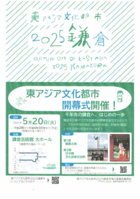 鎌倉市は、日中韓3か国において文化芸術による発展を目指す都市に選定され、現代の芸術文化や伝統文化、また多彩な生活文化に関連する様々な文化芸術イベント等を実施する「東アジア文化都市事業」に取り組んでいます。この度日中韓の芸術団による公演等を行う開幕式を開催します。ついてはその開幕式に来場希望の方は下記のチラシの二次元コードよりお申し込みください。二次元コードが読み取れない場合は鎌倉市の代表電話0467-23-3000より東アジア文化都市事業担当:鋤柄・奈須 内線2759・2925へお申し込みください。