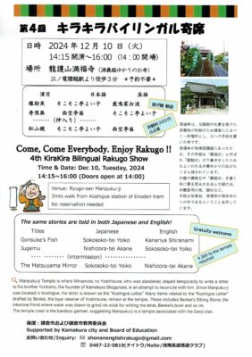 12月10日(火)に腰越の満福寺で14:15から16:00まで開催。入場は無料ですがお寺の拝観料が必要です。