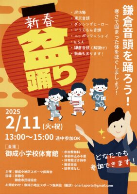 御成小学校体育館で2月11日(火・祝)に新春盆踊りが開催れます。事前参加申し込みは不要で、参加費は無料です。多くの方のご参加をお待ちしています。