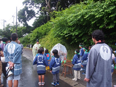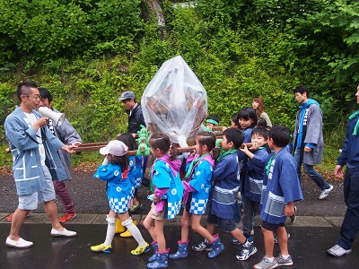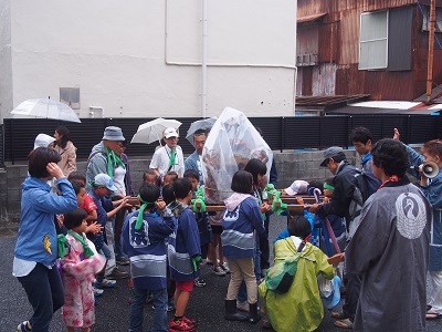 雨のためご神体がビニールカバーの向こう側に見える、ちょっと変わったお神輿担ぎとなりましたが、子どもたちは傘もささずに「ワッショイ!」とスタート。