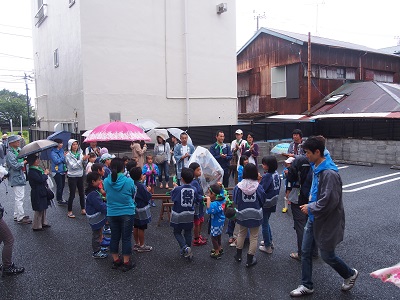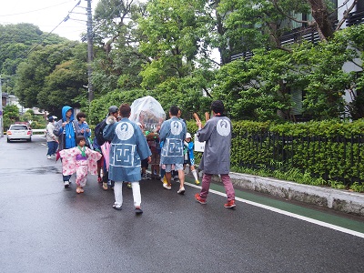 車も多い休日ですが、何とか事故もなく佐助自治会館まで到着。子どもたちにはおにぎりと飲み物、おやつが配られました。大人の方にはビールも。しかしゆっくりしている時間はありません。すぐに次の場所へ出発です。ここからの道のりは、車があまり通らない笹目の住宅街をぬっていきます。途中、雨で疲れて声が出なくなる子も列を離れてしまう子もほとんどいなく、みんな元気に「ワッショイ!」
