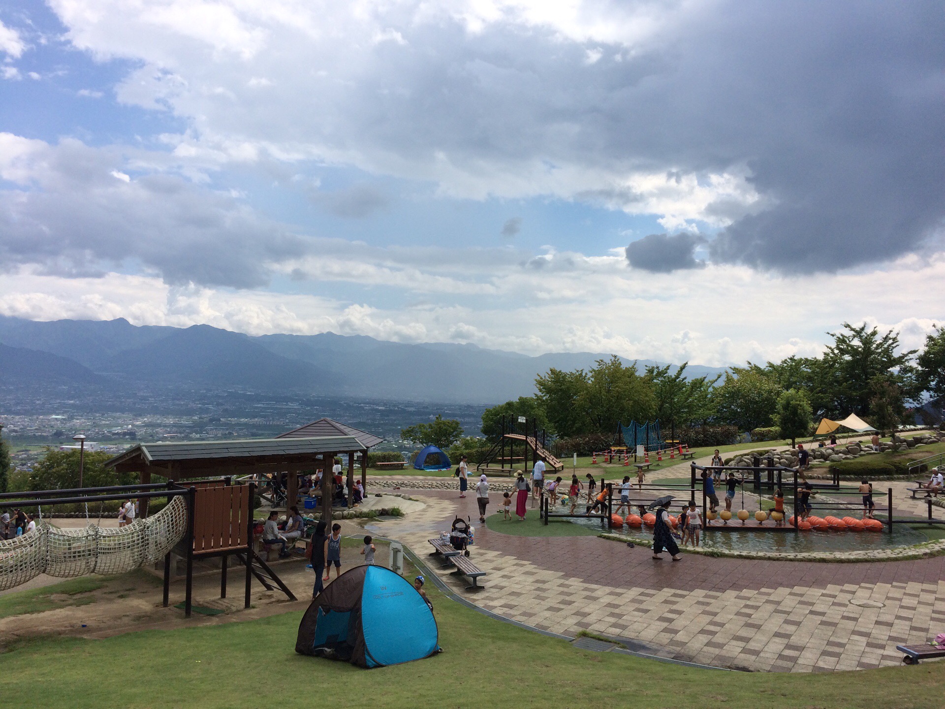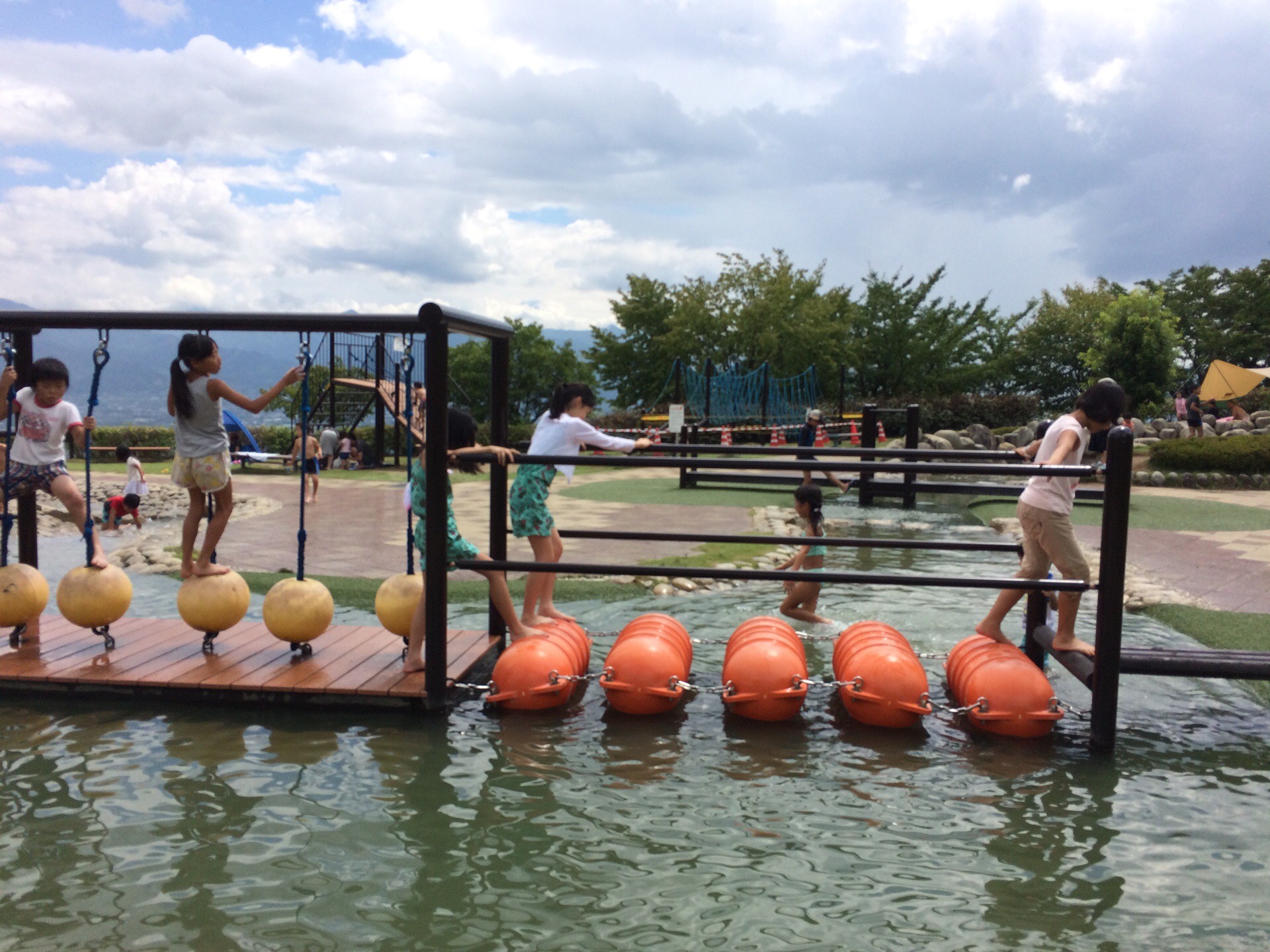 快晴が続く山梨の旅、最終目的地のフルーツ公園に到着すると、標高が高いからか、突然土砂降りの雨。フルーツ公園の駐車場に到着してもまだ雨が 降っていたので、バスの中でお弁当を配ることにしました。すると、すぐに雲が流れ、晴れ間が見えてきたため、各自配られたお弁当を持っていざフルーツ公園へ。事前に水遊びができる旨を連絡しておいたため、さっそく水着に着替えるお子さんもいました。保護者の方々は木陰でレジャーシートを敷いてお弁当の準備。桔梗屋さんでピックアップした社員弁当はなんと320円という驚きのお値段でした。メニューは八宝菜。なかなかのボリュームで、お腹も満足でした。フルーツ公園では3時間弱ほど遊ぶ時間を設定したため、子どもたちは存分に水遊びや追いかけっこなどを楽しむことができたようです。保護者は、園内にいくつかある大きなドームのひとつで販売しているスムージーでさっぱりしながら子どもたちの遊ぶ様子を眺め、ゆっくりとおしゃべりを楽しむことができました。