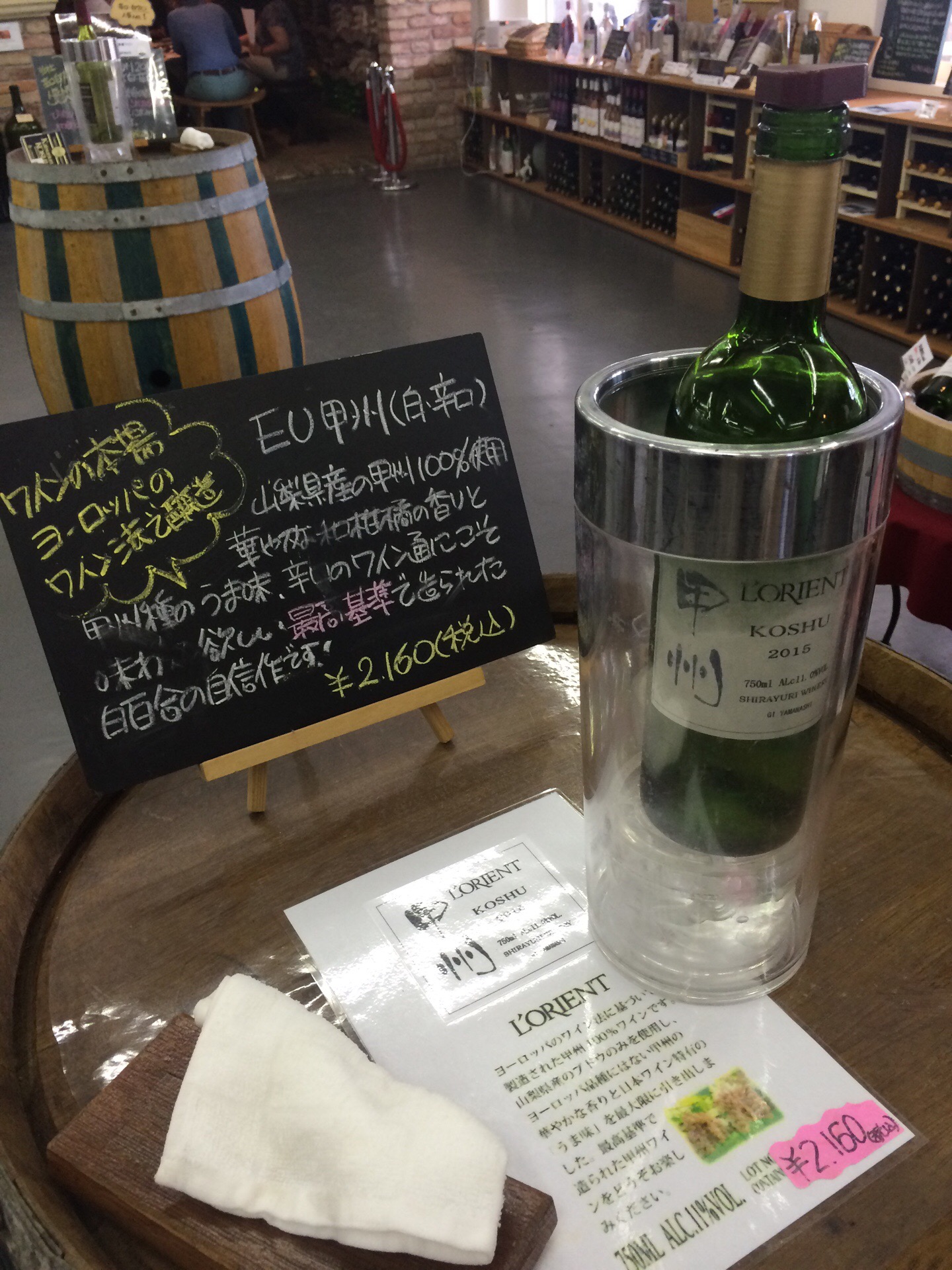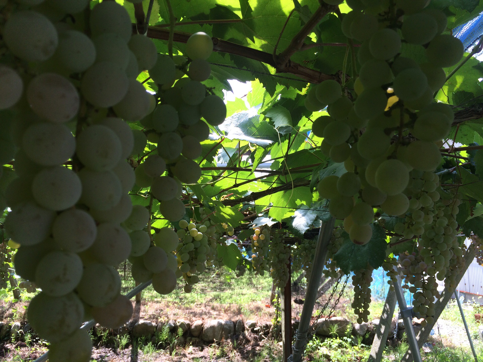 信玄餅を堪能した後は、「山梨といえばぶどう」、白百合醸造・ロリアンワインさんへ。こちらでは、ぶどう園・ワイン工場見学、そしてぶどう踏み・ジュース作りを体験することができました。たわわに実ったぶどうは見るだけでも満足ですが、少しずつ味見もさせていただき、さすがぶどうの産地、太っ腹だなあと感心させられました。そしてもちろんワイナリーなのでこちらではワインの試飲をされる方が多いのですが、それは子ども会の行事、今回はぶどうジュースにしていただきました。しかしながら、自宅では一房ずつしか食卓に上がらない比較的高価なぶどうをふんだんに大きな桶に入れ、みんなで踏むのはなんと快感でしょう。気温も高く暑い中、ぶどうを踏むことで足元がひんやりして、しかもできたジュースは飲み放題。何も加えずあま~いジュースを何杯も飲むのはやはり女の子でした。ぶどう踏みが終わると、大人はこぞって室内のワイン試飲コーナーへ。全体的に飲みやすいワインが何種類も置いてあり、小さなカップではありましたが、全種類飲んだ方は何名かお顔が赤くなっていました。子どもたちはワインのラベルに色を塗ってオリジナルを作成することができました。