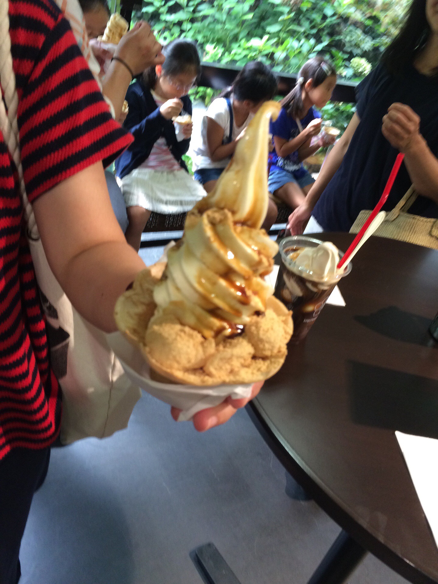 まず最初に到着したのは、信玄餅で有名な桔梗屋さんの工場。こちらは信玄餅の詰め放題を毎朝開催しており、多くのお客さんでにぎわっていました。しかし私たちの目的地は詰め放題ではなく、信玄餅の工場。10分ほどの見学でしたが、みんなが大好きな信玄餅が出来上がっていく工程を、飽きることなく頭上から見ることができ大満足。特に、信玄餅のフィルムの風呂敷の部分はやはり手作業でひとつひとつ結んでいるのだなあ、と感心しました。見学後はカフェで「信玄餅ソフト」、「信玄餅かき氷」をみなさんで堪能。それぞれに信玄餅がついていて、冷たくて固い新しい触感も楽しめました。バスの出発時間までは、アウトレットでお買い物をする人も。残念ながら割引された信玄餅は売り切れてしまっていましたが、それでもたくさんのお菓子が半額になっていて、こどもたちよりも保護者の方々が大興奮だったように思います。子ども会役員はこちらのコンビニで事前に予約しておいたお弁当をピックアップしました。