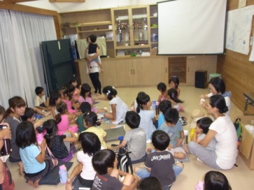 自治会館内に特別スクリーン(?)を設置して、映写機を使用した16ミリフィルムでの子ども向け映画鑑賞会。当日は、映写機の免許をお持ちである、佐助自治会長の森本さんが映写をして下さいました。子ども達には普段馴染みのない16ミリ映写機。「カタカタカタ・・・」という動作音を聞きながら映画の始まりを待つ子ども達の表情がとても印象的でした。