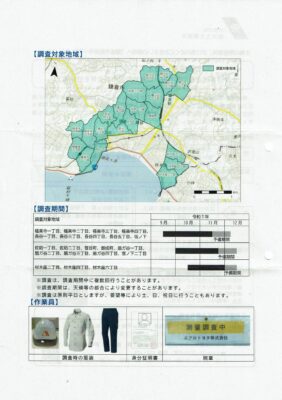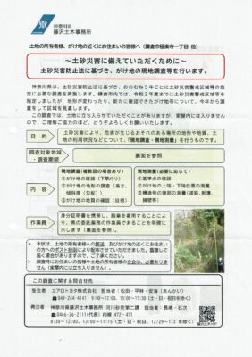 神奈川県では土砂災害防止法に基づき、土砂災害警戒区域等の調査を今年度行います。土地に立ち入らせてもらうことがりますが、建物内には入りません。詳しくは下記の案内をご覧ください。