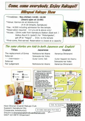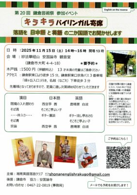 佐助2丁目にお住いの原澤さんが鎌倉芸術祭のキラキラ バイリンガル寄席に参加されます。落語を日本語と英語の二か国語でお聞かせします。パンフレットの鹿鳴家 白波が原澤さんです。
