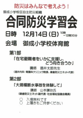 御成小学校区の自主防災訓練が実施されます。今年は在宅避難についての講演や先日市内で起きた断水についての体験談をお伝えします。