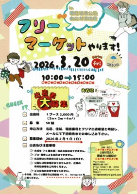 3月20日(金)に開催されるフリーマーケットの出店者を募集します。募集は50組。申し込みは下記のチラシのメールから申し込みください。