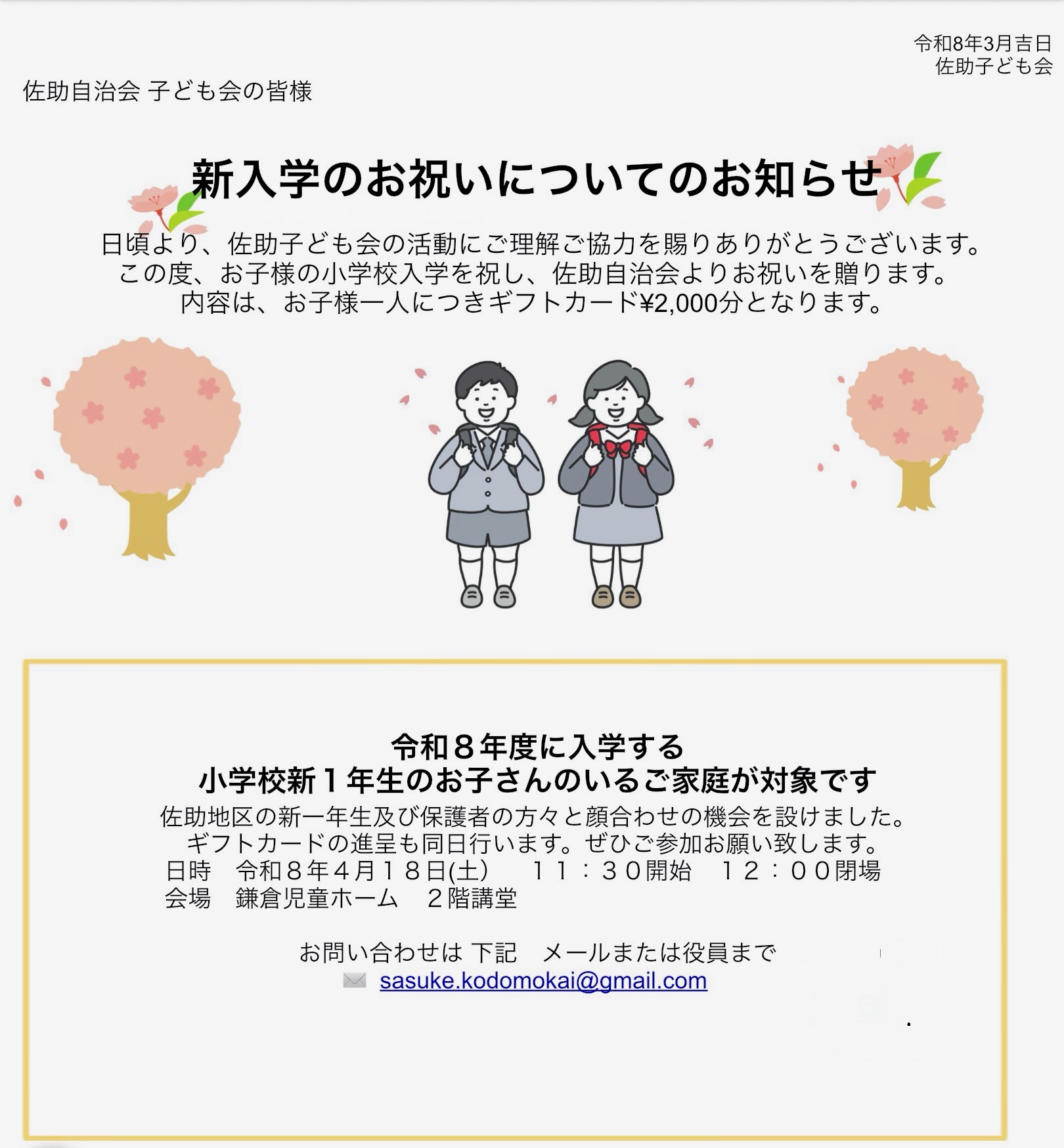 小学校ご入学おめでとうございます 佐助自治会では、小学校にご入学されましたお子さまを対象にお祝いを行っております。 対象となるお子さまがいらっしゃるご家庭は、子ども会までご連絡いただけますと幸いです ご連絡をいただいた方には、今後の行事などについてご案内させていただきます。 Screenshot