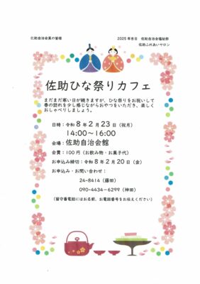 2月23日(月)昨年に続き佐助ひな祭りカフェを実施します。楽しいおしゃべりとトランプ等のゲームを楽しみましょう。日時、連絡先は下記のチラシをご覧ください。